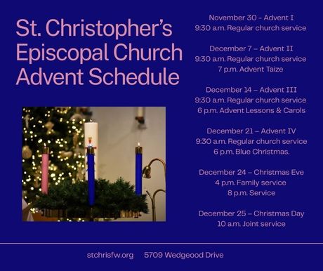 The 9:30 a.m. service is broadcast on YouTube. Please email office@stchrisfw.org for the service booklet.